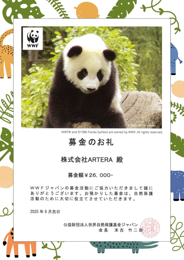 このたび、京橋・ギャラリーくぼたにて開催された 『Special Exhibition ARTERA ART展 #1 Animal』において、出品作品をポストカード化し販売した売上げ全額26,000円 を、2025年8月26日に環境保全活動のために「自然保護団体」に寄付いたしました。