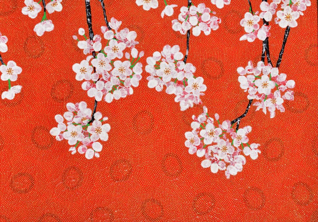 桜は一瞬の輝きや儚さを表し、朱色との強い対比によって視線を引き寄せます。