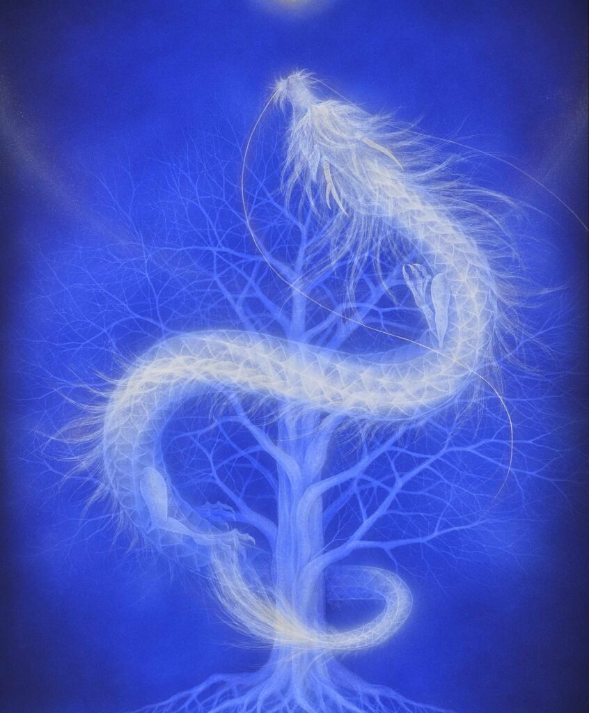 『生まれいずるところ』は、月暈の光を浴びた大樹から、世界の安寧を願う人々の想いが、龍の姿として顕現したところを描いたものです。