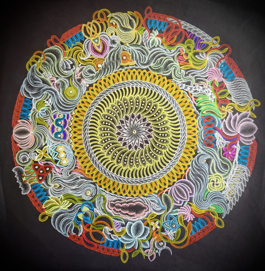 <曼荼羅>という大いなる存在に触れながら描くことに、日々畏れと敬意を抱いています。黒の紙を”宇宙(心)”と見立て、法則に従って線を引き、コンパスで幾重にも円を描きます。そうして現れる美しい曲線に導かれながら、文様の塊が静かに姿をあらわします。その上に砂粒を置くように一粒一粒展を重ね色を重ねていきます。”見えない世界”と”現実”のちょうどあいだに広がる私の曼荼羅の世界-その不思議さやおもしろさや美しさを感じていただけたら幸いです。